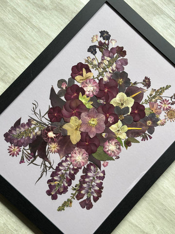 The design of your bouquet will characterize the look and feel of your live flowers. The real fun begins when we design your unique pressed floral artwork. Design options range from traditional to modern themes, and you will have the opportunity to confirm the final design before the artwork is glued, framed, and delivered to your home.